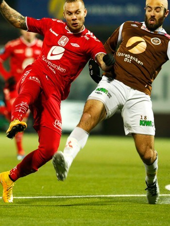 FEID AV BANEN: Marcus Pedersen og Brann ble regelrett overkjørt av Mjøndalen. Foto: Bendiksby, Terje / NTB scanpix